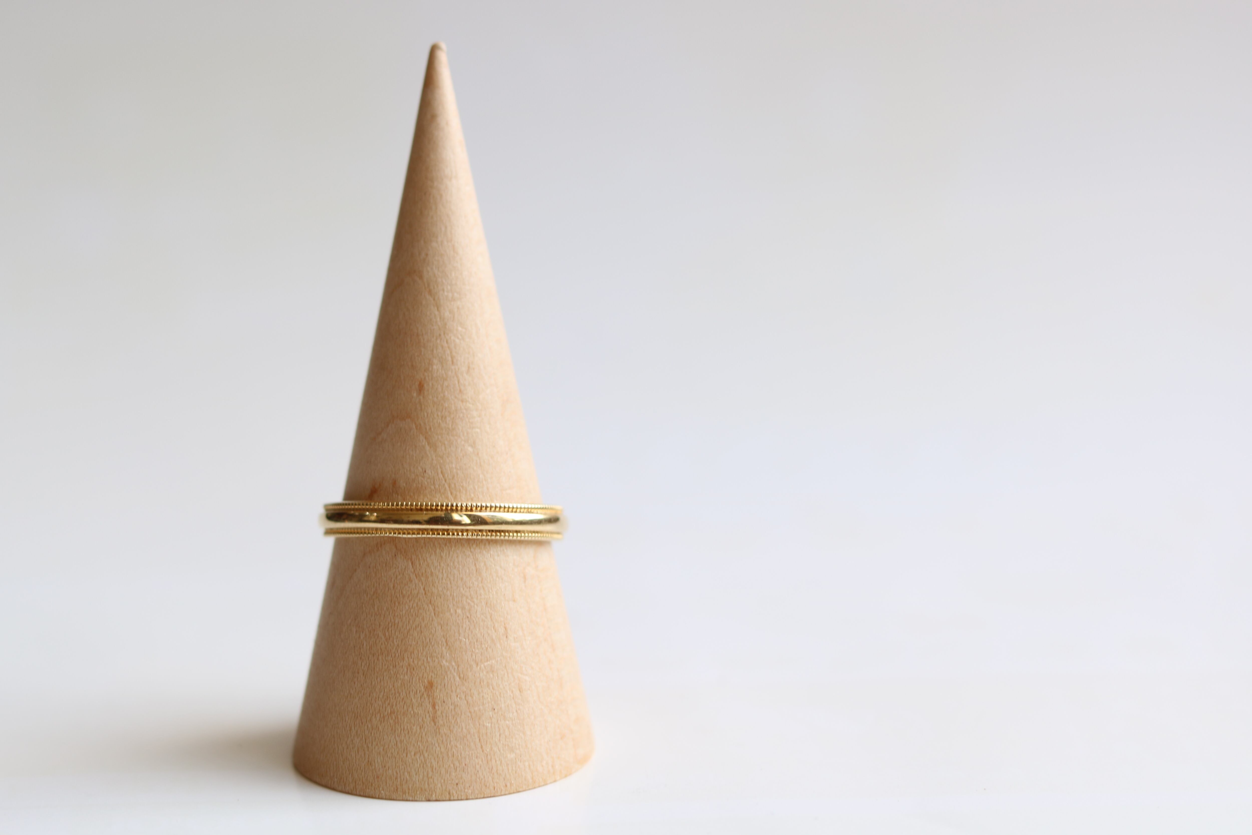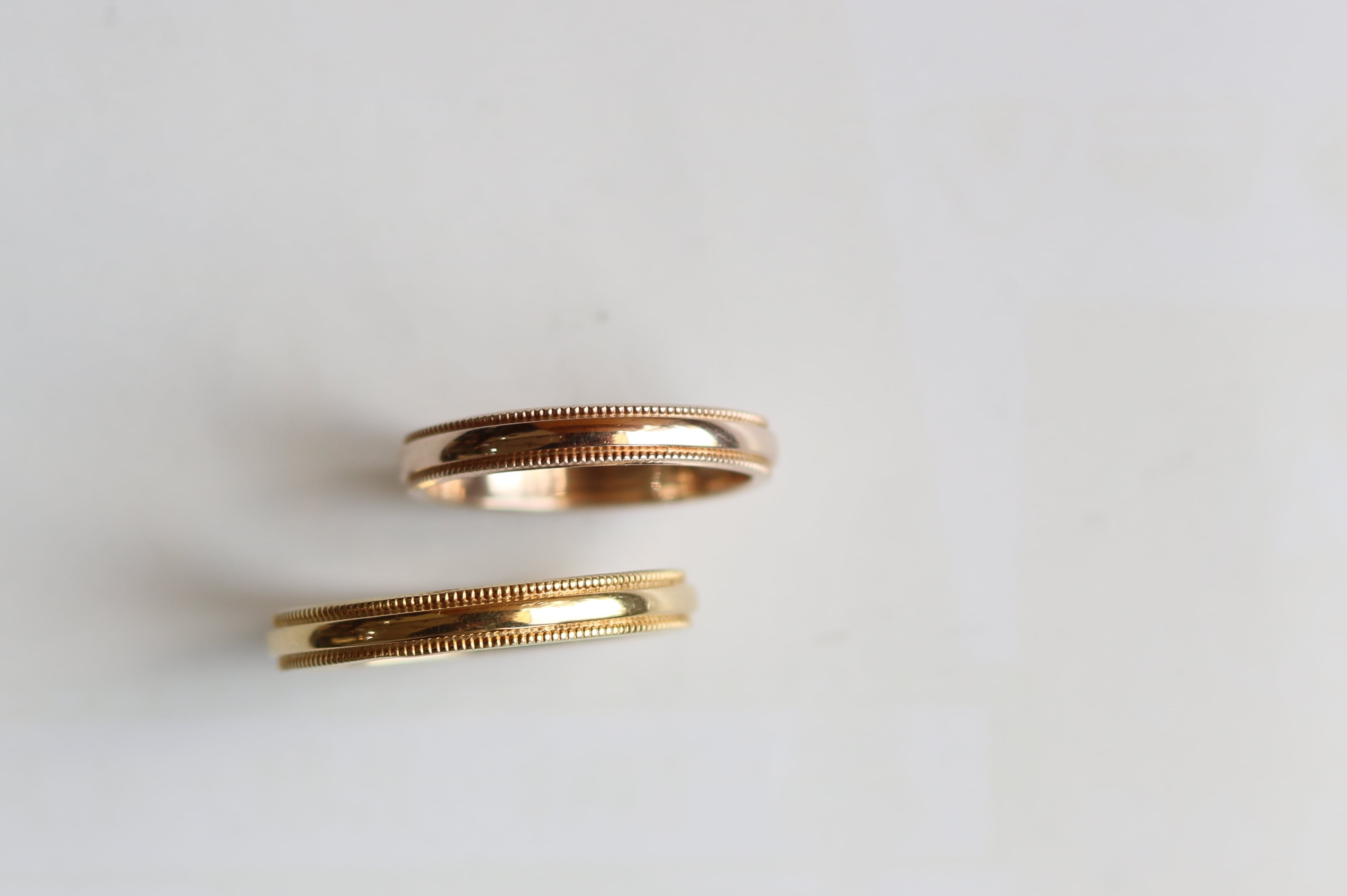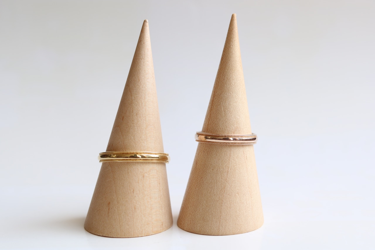 アンティーク風のミル打ちが施された、使い込むほどに味わい深くなる結婚指輪。