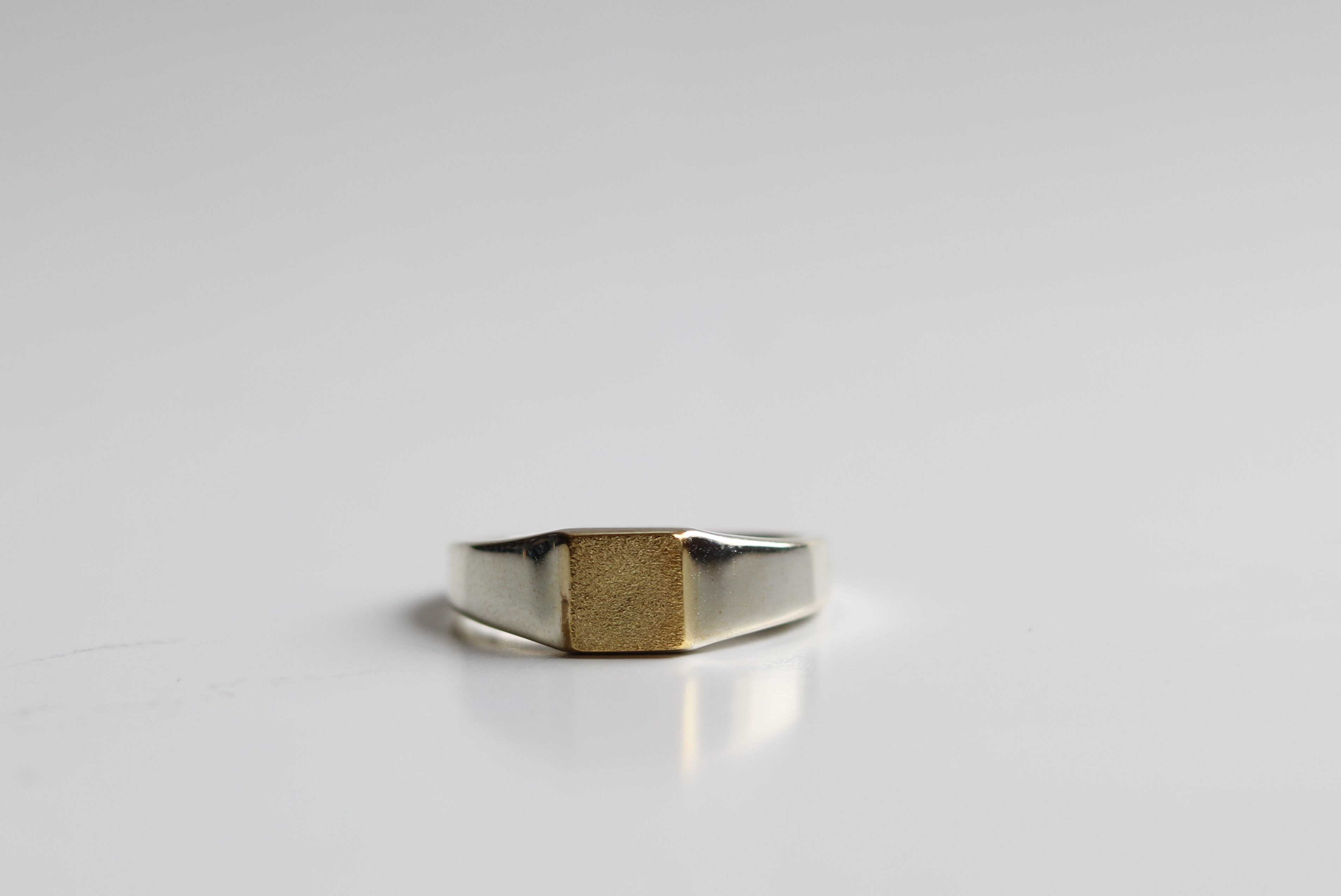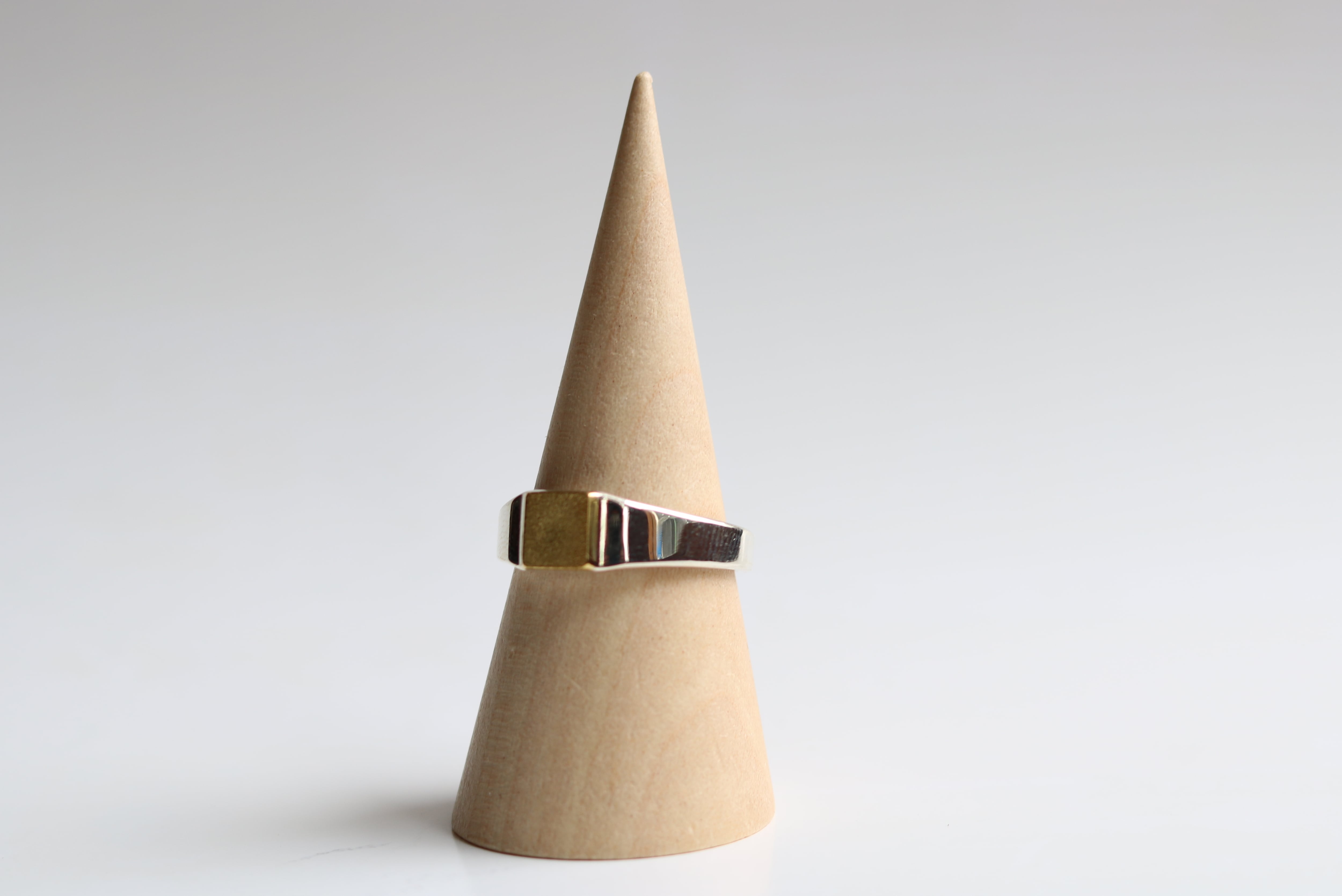 シルバー&ブラスで作られた印台シルバーリングR-84。洗練されたデザインと素材感が魅力的な一品です。手元に品のあるアクセサリーをお探しの方におすすめです。